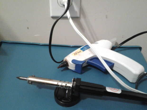 Caliente el cautín y la pistola de pegamento caliente para arriba y desenrosque el frome la hoja del cuchillo.