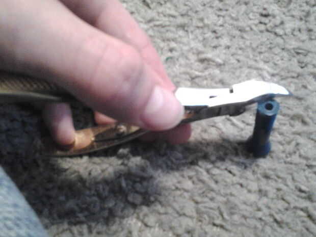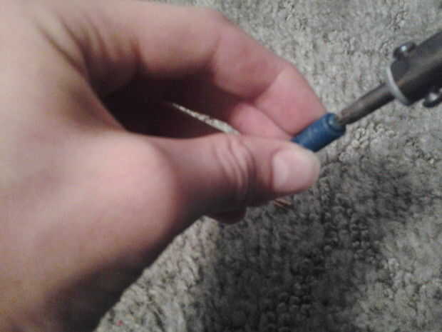 Presione la punta del soldador en la abrazadera de la lámina. romper el extremo de un pedazo de metal y recortar los bordes todo derretidos.