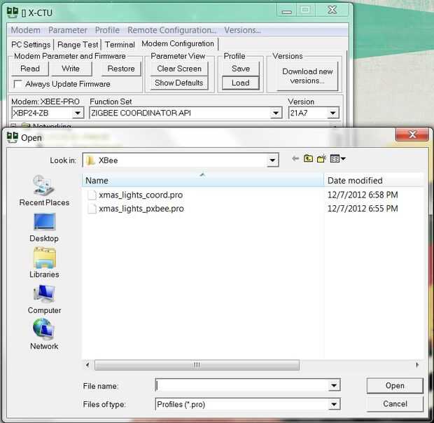 Lo primero que queremos hacer con el XBee es asegurarse de que el firmware ZB es hasta la fecha. Si tienes Windows, usted puede Descargar y ejecutar el X-CTU. Una de las cosas difíciles de trabajar con un XBee programable es que el coprocesador (programable) de FreeScale se encuentra entre el puerto serie y el procesador de Ember (ZigBee). Para hablar con el procesador de Ember, necesita acceder al cargador de arranque en la FreeScale y ponerlo en modo de bypass (utilice estas instrucciones para X-CTU). Ahora que estás en modo de gestor de arranque, vaya a la pestaña de "configuración del módem" y haga clic en el botón de carga en "Perfil". Se abrirá un cuadro de diálogo. Utilice los archivos de "Pro" en github para configurar el XBees: "xmas_lights_pxbee.pro" está para el XBee programable conectado a la hebra de luz de Navidad y "xmas_lights_coord.pro" es para la serie dos XBee conectado al ordenador. Con configuración predeterminada, los dos XBees debe automáticamente se unen cuando usted Acciona encendido al mismo tiempo. Sabemos que a ellos se suman cuando ambos el XBees parpadear su asociación LEDs.