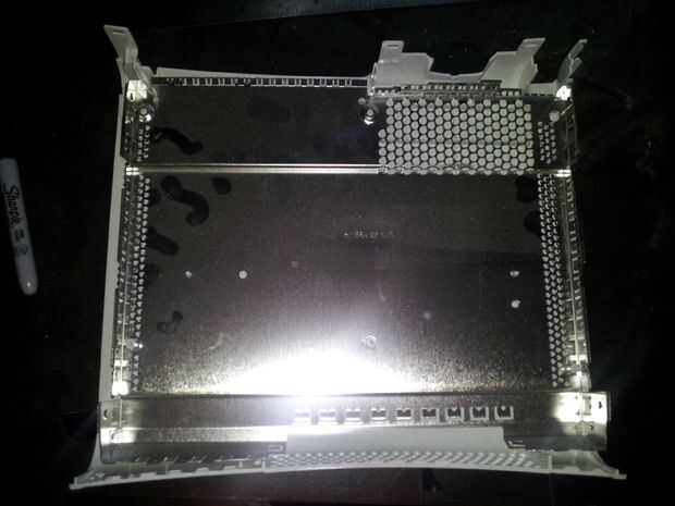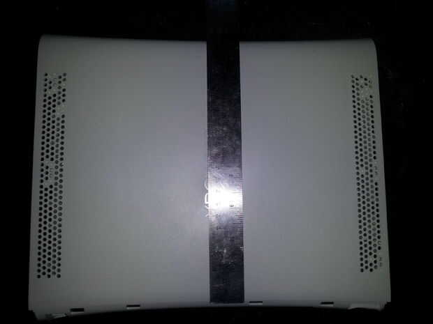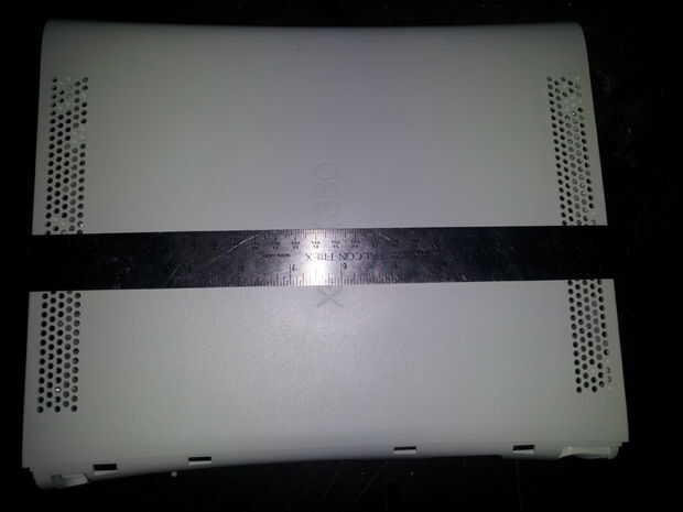 Tómese su tiempo en esta parte. Medida dos veces y taladro una vez de lo contrario que esto se verá de centrado. Mi Xbox 360 se trata de 29,5 Cm ancho y 22 Cm altura esto hace que el centro de punto en 14,75 Cm x 11 Cm. Si no has quitado ya la lata por la parte inferior de la caja lo hacen antes de perforar. Sólo un par de fichas derretidas que mantenerlo en su lugar solo uso algunos de tu DIY músculo y sacar ese pedazo de chico malo de la lata.  Hacer un taladro de la marca en el punto de 14,75 Cm x 11 Cm y busto de su taladro.