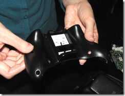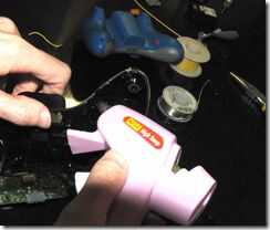 Para reubicar los botones primero tenemos que hacer agujeros en el caso de los microinterruptores, así que usamos la punta de la pistola de pegamento caliente para fundir un agujero en el controlador. (esto huele mal)