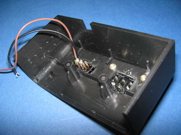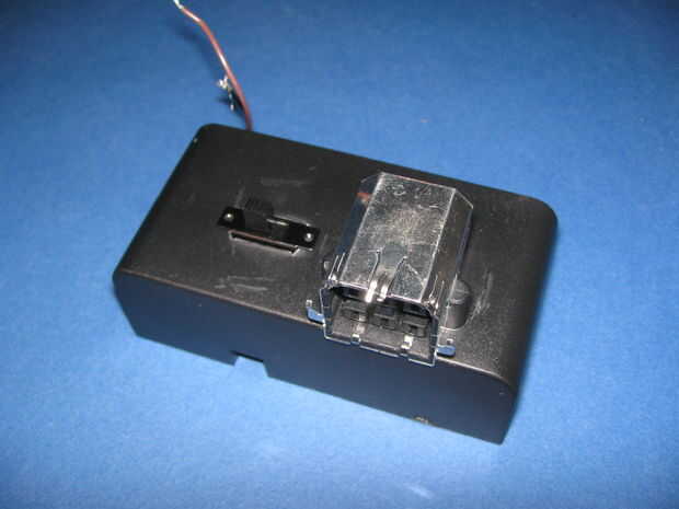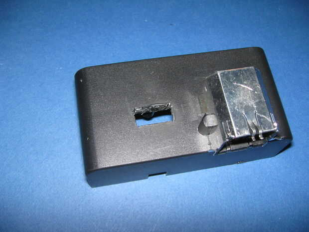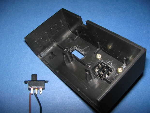 Sacar la herramienta de corte fusión plástica otra vez y hacer un agujero para el interruptor. Limpiar los bordes con el cuchillo otra vez y asegúrese de que el interruptor se ajuste. En este punto el interruptor no hace falta salir más, así que usted puede instalarlo semi-forma con algun pegamento caliente en la parte inferior. Ahora puede retirar el conector de alimentación en la preparación para soldar los cables a él.