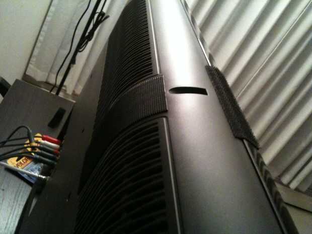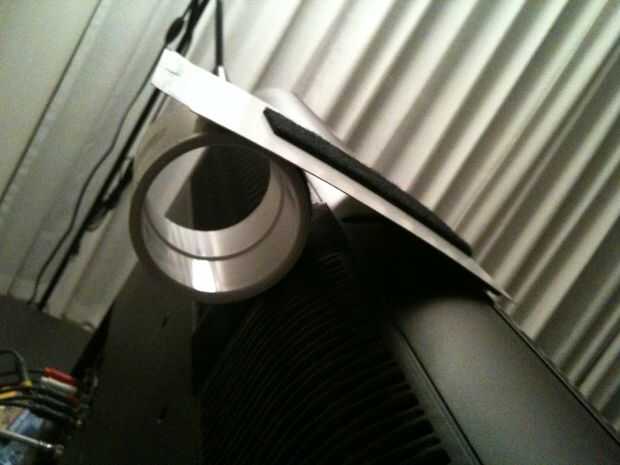 Agarrar el tubo de PVC preparado y coloque un lado de la tira de velcro en la amplia franja en la televisión, la parte superior del tubo debe alinearse con el borde superior de la TV. Luego, tome el plato cuadrado y coloque el lado con tanto la amplia y estrecha tira de velcro hacia abajo, asegurándose de que las tiras se alinean con la tira en la parte delantera de la televisión y el tubo. El velcro se asegurará de que todo permanece en su lugar.