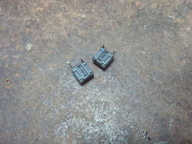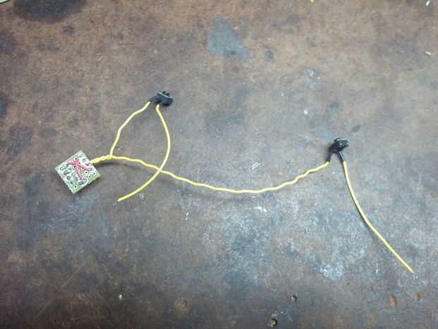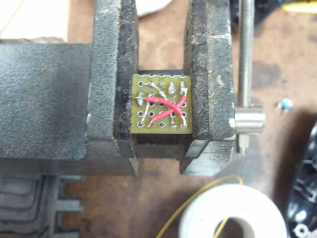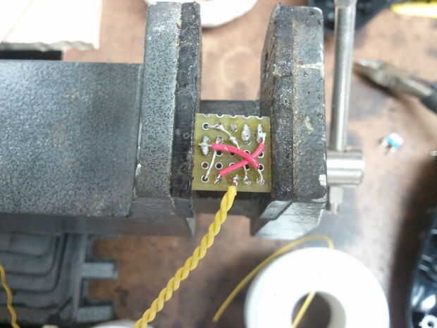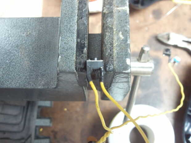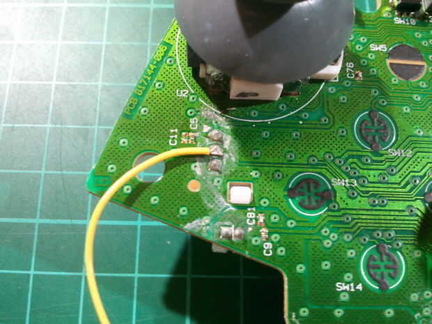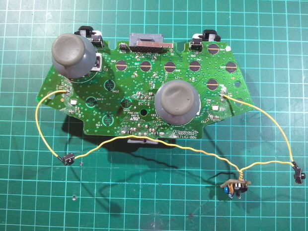 Now it's time to connect the momentary switches. Porque sólo dos de las cuatro puntas en cada botón se utilizará, para empezar, rompieron dos cables de cada botón que no se van a utilizar. Si decides hacerlo también, por favor asegúrese de que los conductores restantes son los que tienen sus conductores normalmente abierto y cerraron solamente cuando el botón es presionado. A continuación, conecte dos cables a la clavija 3 de TLC555. Conecte los cables a los interruptores momentáneos, un cable a cada uno. Conecte un segundo cable al conductor que no está conectado en cada uno de los botones. Utilice tubos del encogimiento del calor para proteger las conexiones. Luego conecte los cables de segunda en los botones a los gatillos del mando. Uno para el gatillo izquierdo y el otro el gatillo derecho.