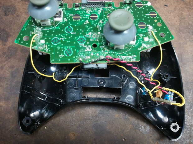 Ahora que el circuito es completado, volver a montar el regulador. Son más probable es que sólo podrá encajar uno de los motores del vibrador en el controlador. Decidí poner uno con la masa más grande en su eje en y dejar de lado uno con la masa más pequeña. Utilice pegamento caliente para conectar los botones y la resistencia variable. Después de pegar todo, asegúrese de que no interfieren con otras piezas en movimiento y que todo encaja en el controlador. Los lugares que elegí poner mis botones están justo al lado de las palancas conectadas a los provocadores; Si se utiliza demasiado pegamento, interferiría con las palancas.