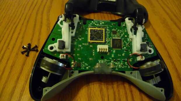 Hay siete tornillos que sujetan la carcasa trasera en el controlador. Tres a cada lado y uno por debajo de la etiqueta de código de barras bajo la batería. Este controlador de apertura anulará la garantía del controlador - como si significaba algo. Los siete tornillos y colocarlos donde no perderlos. Si lo desea, se pegan los tornillos a una tira de cinta adhesiva. Sólo tire de la carcasa trasera del frente y debe pop off. Levante el dos rumble motores y la placa base de la controller. No hay razón para quitar los botones o cojines de parachoques, todo lo que necesitamos es que los LEDs.