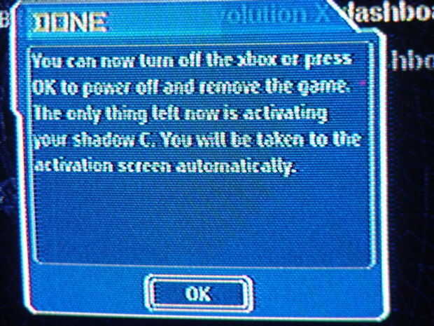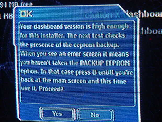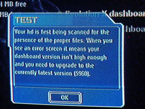 4) tu disco duro entonces debe ser escaneado de los archivos adecuados. Seleccione ok, entonces otra ventana emergente. Leer y si ves una pantalla de error (incluida a continuación) sabes que no volver hasta la eeprom o no tienen una consola de xbox lo suficientemente alto. Todo esto significa es que usted necesita para obtener una copia de halo 2 o cualquier juego nuevo, dashboard será actualizado con la versión incluida en ese disco y halo 2 tiene un guión lo suficientemente alto como para proceder.