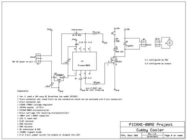 El conector de la fuente es modificado para encajar el conector en mi PCB. Se regula el voltaje de entrada de 12 voltios a 5 voltios por el LM340 usando dos condensadores suavizados. 5 volts entonces alimenta el microcontrolador y la tensión de dividir el circuito de la resistencia de termistor y 2,2 K ohms. El voltaje producido en el pin de ADC del Picaxe varía a la resistencia cambiar el termistor debido a cambios de temperatura. El programa de software determina si va a enviar una salida a un Mosfet (switch) que activa o desactiva, permitiendo que funcione o no el ventilador. Un diodo flyback protege eléctricamente el Mosfet. Un LED es opcional. Tengo un puente en él puedo desactivar el LED si no quiere que la señalización luminosa que se enciende el ventilador.