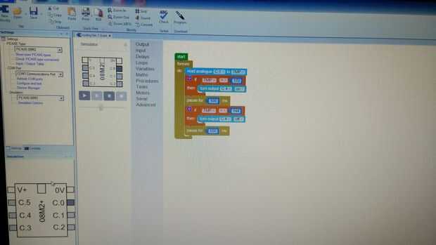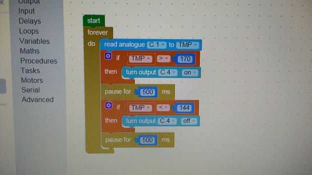 Empecé con la adquisición de las lecturas de los valores de temperatura implicados en el espacio del compartimiento utilizando un multímetro digital y un termistor. Entonces abrió mi software de programación de Picaxe en mi PC (libre descargar y usar) y comenzó la programación. He utilizado bloques. Se trata de una muy simple interfaz de programación gráfica, su sólo arrastrar y soltar. He estimado la analógica en valores digitales (0 a 244) y utilizado para los puntos de ajuste para encender y apagar el ventilador. He flasheado el chip Picaxe con mi casera programador de Picaxe.