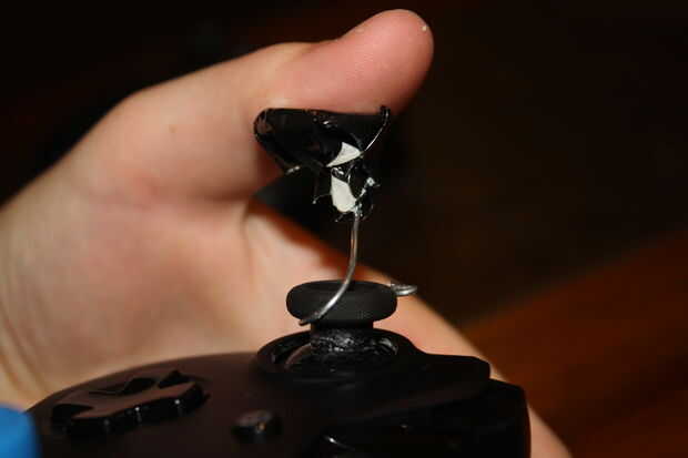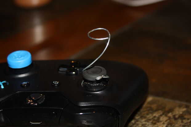 El nuevo controlador de Xbox elite tiene la capacidad de cambiar entre normales y largos palos para precisión extra. Para hacer tu propio palo de pulgar extendido necesita un clip de papel y alguna cinta adhesiva para conductos. Doblar el clip como se muestra en la foto (que tenga que ajustar un poco a ti mismo). Rematar con alguna cinta y clip a su controlador. Si alguien sabe una forma mejor de hacer esto me dicen en los comentarios:)