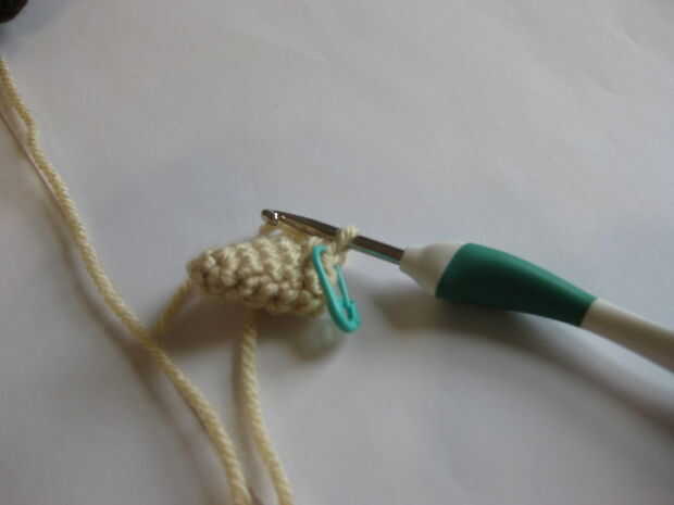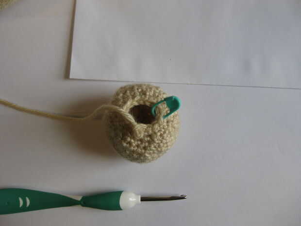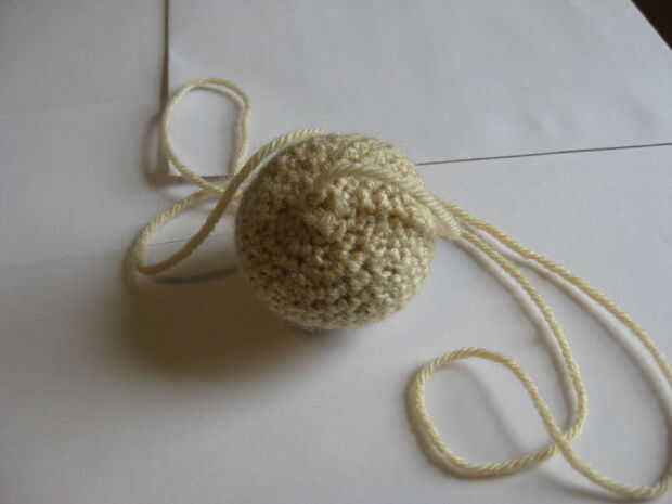 Se trata de una esfera de amigurumi básico. Para hacer la más alargada, agregue más filas en el centro en 30 puntos de sutura. Uso el hilo beige