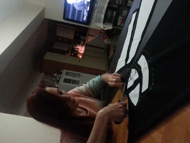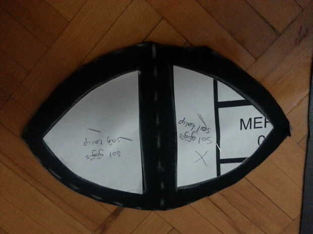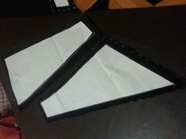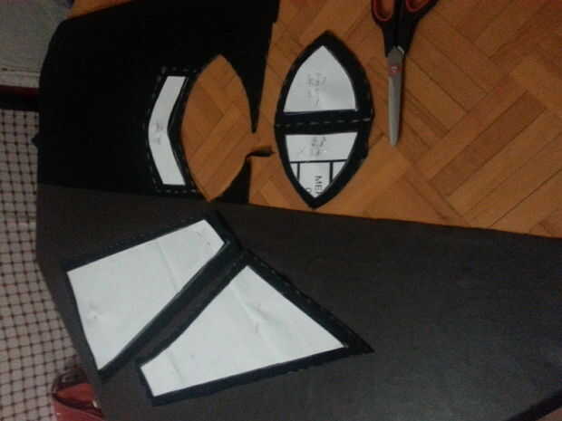 Compró 1.5 x 2 metros de cuero marrón oscuro (falso), luego aplicar los patrones de la piel. Lo importante que tenga en cuenta que debe cortar el cuero de 1-1.5 cm fuera de la línea del patrón. (Pero también trace las líneas de los patrones). Utiliza estas piezas adicionales mientras que usted está cosiendo :)