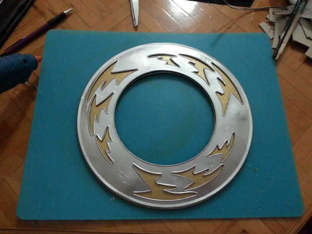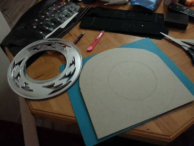 Hice la funda con espuma de poliestireno. Luego cubre con borlas de cuero y algunos hechas y decorados con pegamento caliente. (Pintar las piezas de pegamento pintura metalizada de color cobre) Y añadido algunos remaches.