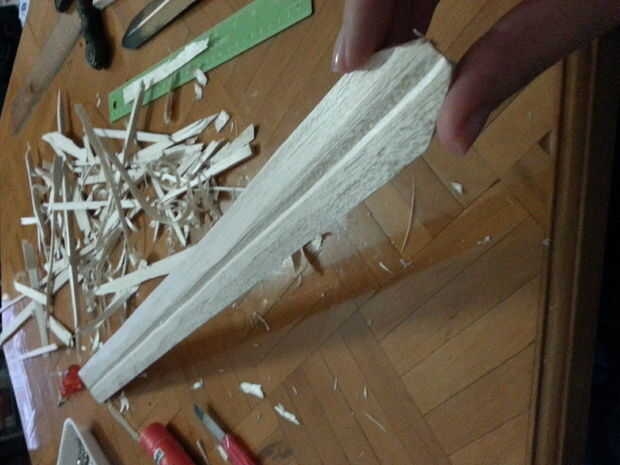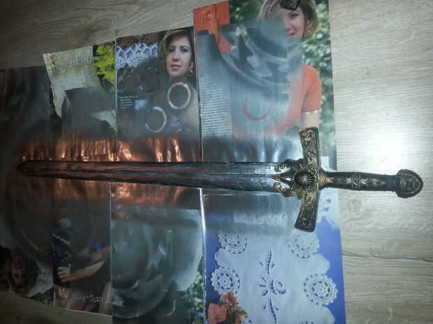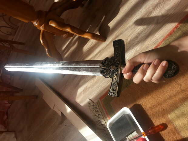 No tengo una espada real (recuerdo que tuve uno!) así que tuve que hacerlo yo mismo. No pude encontrar un tamaño adulto así que compré una espada del tamaño de los niños de una tienda de juguetes y tomar la parte de hoja de y utiliza la pieza de la manija. Hice la parte de hoja de balsa. (Talladas, por supuesto) Luego pintó con pintura de aerosol de plata. Por último, pegué entre las partes de mango.