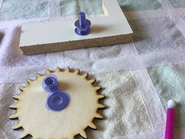 Tome su otro engranaje y perfore un agujero en él según perno de cualquier tamaño que usted va a utilizar. Conjunto para arriba así que una vez que tengas tu equipo parece el cuadro.
