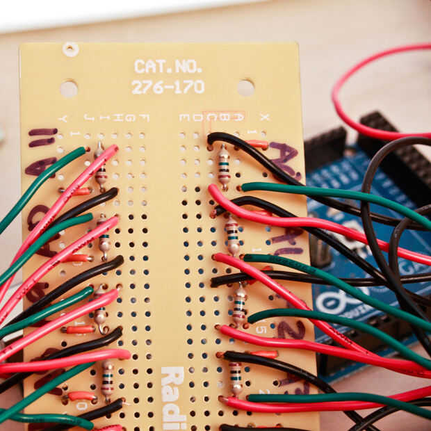Corté 12 tramos de alambre verde que mi "cable de señal" para el Arduino. Cada cable de señal se suelda en el mismo carril resistió positivo del piezo.