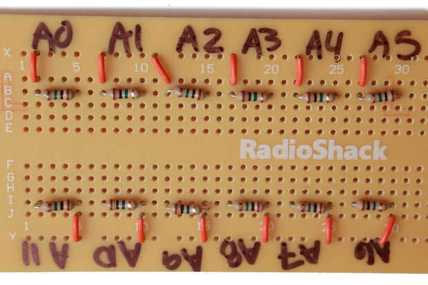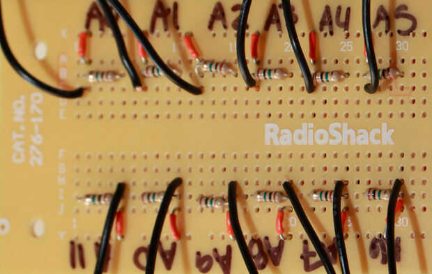 Después de soldar las resistencias en su lugar, corrió un pequeño puente de alambre de un extremo de la resistencia, hasta el ferrocarril más largo en el PCB y señaló mi carril de tierra. A continuación, había soldado todos los cables de tierra de las piezas en su lugar, en línea con el mismo extremo de cada resistencia de puesta a tierra. El positivo de la piezas se suelda en el mismo riel como el otro extremo de cada resistencia.