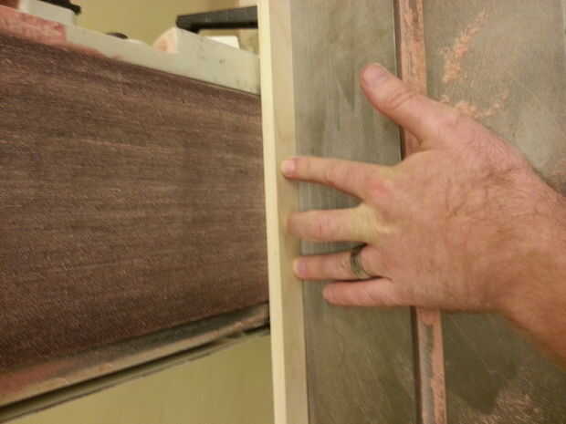 Utilizamos la sierra con una cerca para mantener el mismo espesor a todo lo largo. Ver foto. Luego lija en el lado de corte. Nos quedamos con dos barras rectangulares por a partir pieza cuadrada.