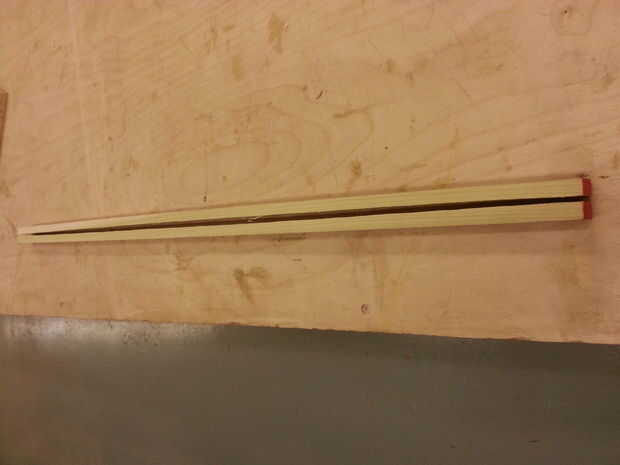 Corte la madera de la Cruz-sección cuadrada longitudinalmente para hacer dos secciones transversales rectangulares. Cortar longitudinalmente cada 3 pies de longitud. Una de estas longitudes de 3 pies se muestra en la foto después de que cortamos. Asegúrese de que hace los dos lados gruesos tan uniformemente como sea posible, por lo que sus campos son en. Usted va ser afinándola más adelante de todos modos, pero aún debe tratar de hacerlo para hacer la vida fácil por sí mismo.