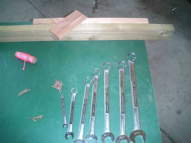 Salir de un juego de llaves. Llaves más grandes tendían a ser más fácil trabajar con y más fuerte. Los tornillos de madera y de madera son para hacer una caja. Los clavos y la cadena se utilizan para suspender las llaves dentro de la caja.