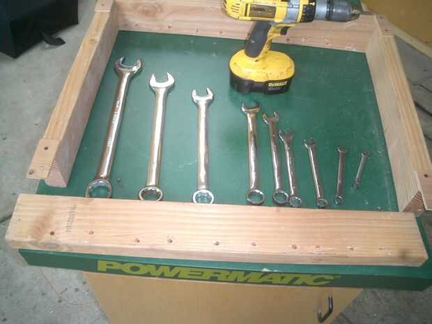 corte 2 pares de longitudes iguales de 2 X 4, o lo que sea de madera te tienen ahí. Es útil disponer de madera con dimensiones de por lo menos una sección de > 3". En esta imagen, las longitudes de la madera son 27" y 18". Eyeball a cuántas llaves que desea adjuntar.
