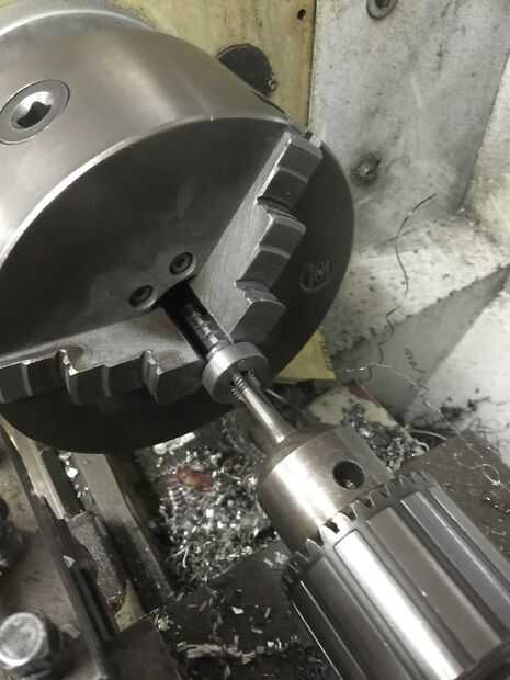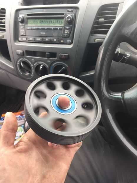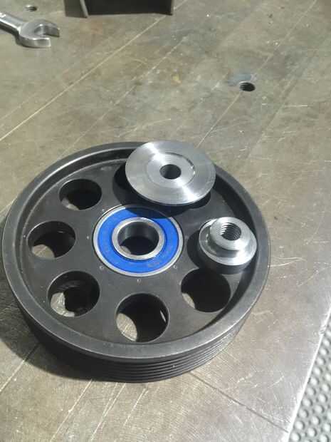 la polea fue general automotriz con un OD de 112mm (lo más cercano a la CA stock uno como podría conseguir) un agujero central de 17mm y un cojinete en pulsa en él. Para montar la polea en el soporte cumplí un pequeño trozo caminado fuera de acción de la barra de 25 mm que fue apretado que tenía que aprovechar en la polea pero no tan apretado es había ralentizado su rotación. mm 17,05 trabajó en. Entonces perforado y golpeado ligeramente un agujero M10x1.5 en el centro.