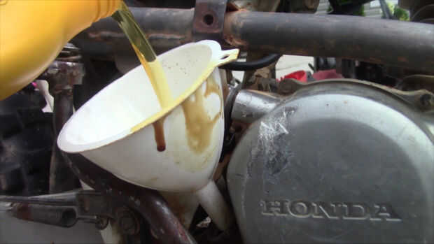 Después, llenar el aceite nuevo en la bicicleta (consulte le manual la xr80 llevó a cuánto aceite necesita, 1 cuarto de galón)