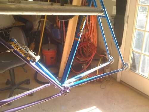 Foto #3 muestra los tornillos de husillo sostiene la unidad Xtends en las punteras traseras moto principal. La abrazadera del sillín no está todavía en el tubo inferior.