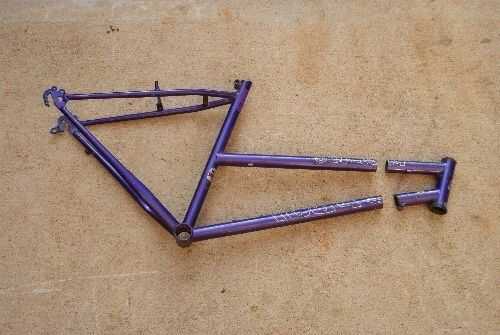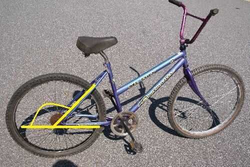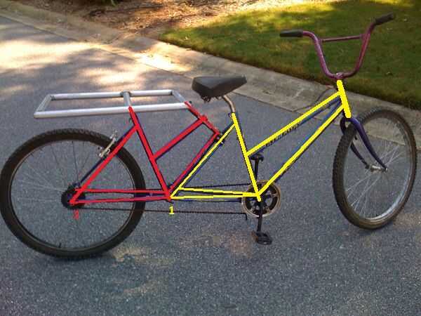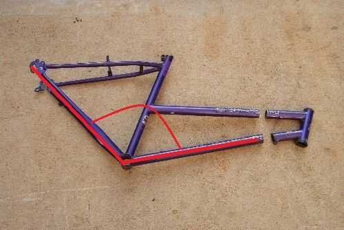 El requisito más importante para el marco de la donante es que el ángulo entre las vainas y el tubo inferior (se muestra con las líneas rojas en la figura 2) debe estar cerca del mismo que el ángulo entre las vainas y los tirantes de la bici principal (se muestra con las líneas amarillas en la figura 3).