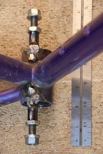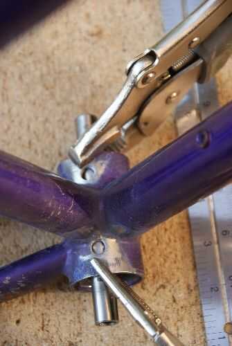 Pulir la parte superior del interior de la caja del pedalier de la bicicleta de donantes y taladre dos orificios de 1/4" para las soldaduras de la clavija. Centre el tubo de metal del eje en la caja del pedalier debajo de los orificios de la soldadura de tapón y sujete en su lugar. Véase la figura 3. Usé pinzas de agarre para esto.