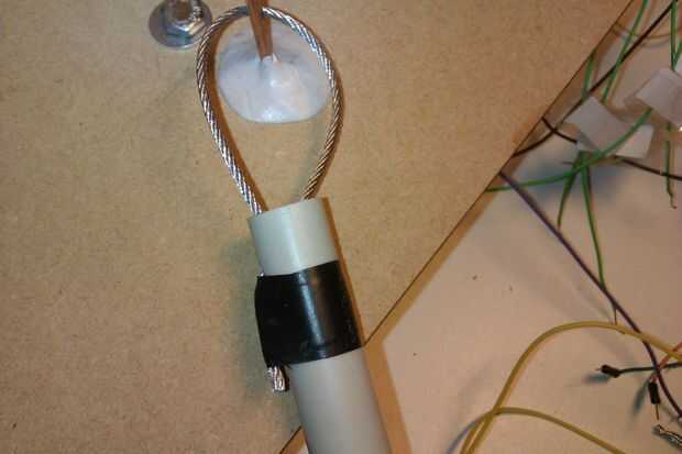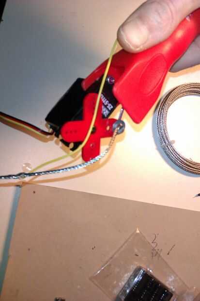 Un trozo de cable de acero fue atado a un extremo del tubo de PVC con algunas fuertes (cinta), el otro extremo del cable va a través del tubo y el mango y está conectado con algunos M3bolts y tuercas al servo.