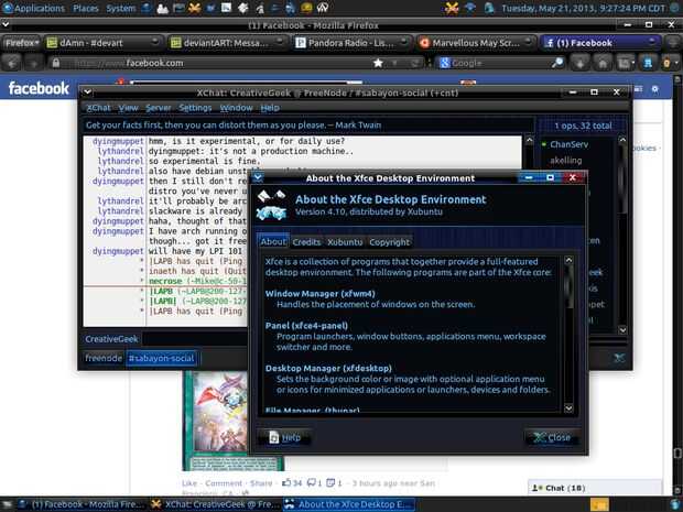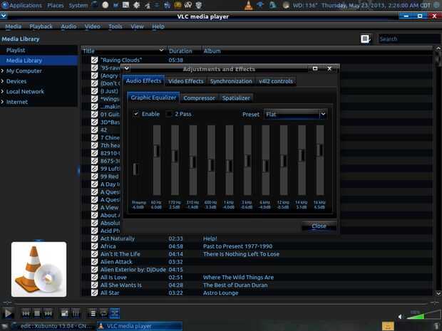 Además, el tema de interfaz que está actualmente en uso es DarkCold ventana tema y los iconos de Azenis, además, también cambié el menú de acciones para mostrar sólo un botón de apagado en lugar de un menú, hace que el aspecto del escritorio, menos abarrotado, y menos como Xubuntu/Xfce, como el viejo GNOME, además, consiguieron composición va en él. También, incluí fotos de mis ajustes de EQ de VLC.