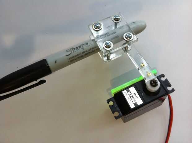 Ahora es el momento para construir un accesorio simple que contiene el marcador para el servo para que puede ser levantado y bajado. Descargar el archivo pen-holder.svg e imprimir dos partes. Puede que necesite ajustar el tamaño de la Plaza, si usas un lápiz que es más grande un rotulador. El conjunto de dos piezas es relativamente sencillo armar y el producto final se ve como se muestra en la imagen. Los pernos se aprieten uniformemente alrededor de la pluma para que no se deslice.