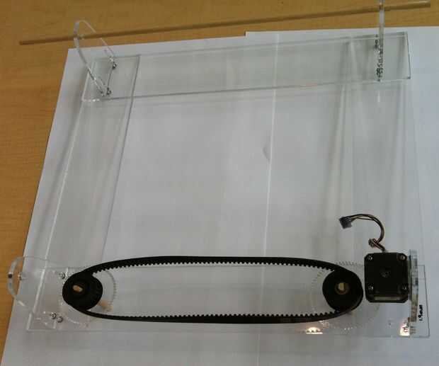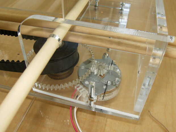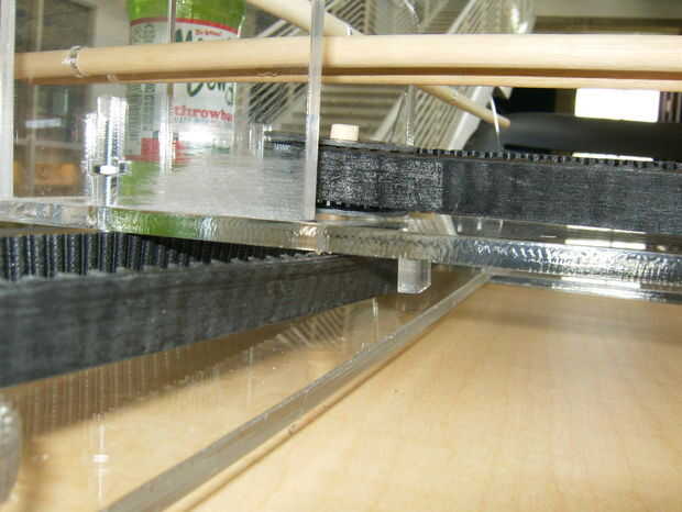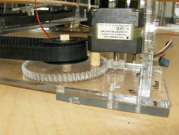 Una vez fijado el motor, coloque la costilla tal que los dos engranajes están alineados. Mantener la costilla en su lugar, mueva el cinturón; Si tu equipo está descentrado, puede que necesite ajustar la posición del motor. Una vez que es encontrado el "punto dulce" para que los engranajes de acoplamiento uniformemente, marcar donde haremos los dos agujeros nuevos para el puntal. Perforar y montar el puntal. También se encontró que agregando acrílico pequeño dos "guías" en la parte inferior del eje y permitió las correas para mover el eje y mejor.