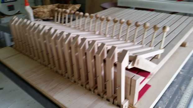 Para establecer las claves primero hice una otra plantilla para taladrar los agujeros para el perno y el perno hacia adelante. Esto asegura que cada agujero es el mismo para cada llave. A continuación he modificado la plantilla para permitir que los agujeros para ser redrilled en un ligero ángulo, y esto permite que la llave gire hacia atrás y de cuarto. En este momento numerados cada tecla porque muchos tuvieron que ajustarse ligeramente para no coger las clavijas estaban en. Después de cada clave suavemente, configurar la captura de cada tecla en el canal que fue cortado en la base. Bandas de goma fueron utilizados para tirar del retén hacia el martillo en la parte posterior de la llave, en un piano real que esto se hace mediante un resorte. Pero las gomas son baratos, fáciles de reemplazar y fácil de afinar para conseguir más o menos fuerza mediante el uso de uno más grande o más pequeño. Tuve algunos africano cuenta de otro proyecto que convirtió en primeros de la llave. Acabado con aceite danés y pulir con una cera de acabado. Usé el ensayo y error para encontrar la altura que sería mejor para las campanas que se cuelga encima de la cubierta. Por último, cuando se colgaron las campanas, pude ajustar la acción de lijado la captura, el martillo, o utilizando una combinación diferente de bandas de goma. Una vez que se jugó sin problemas, es tiempo para diseñar y construir el cuerpo.