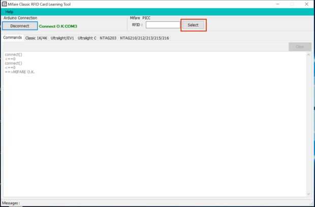 Después el Arduino ha conectado (nota la casilla de conectar bien y estado) colocar la etiqueta cerca del lector y luego pulse el botón seleccionar.