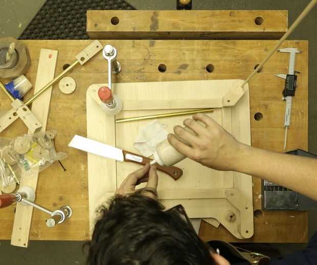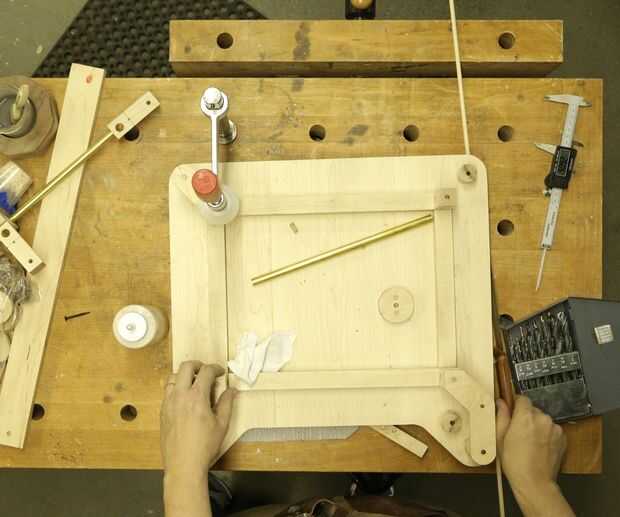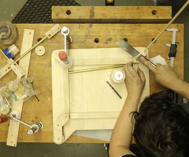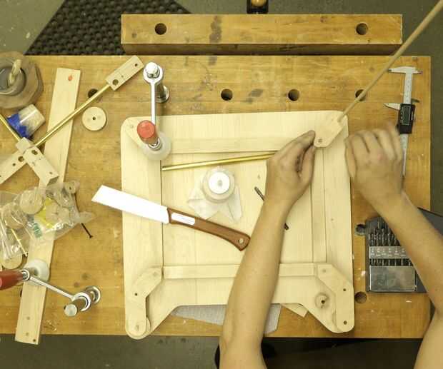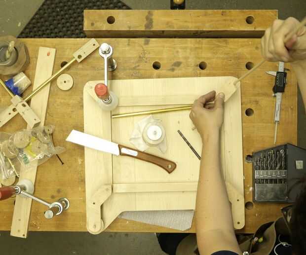 Una vez seco el pegamento, perforé volver a los agujeros de los postes para que los tubos de latón cabrían sin los tacos de Unión en el camino. La sierra japonesa descarga viene bien aquí para cortar la espiga que sobresale de la parte superior.