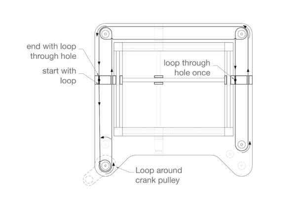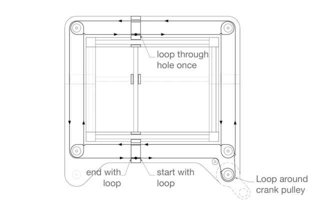 Los diagramas en este paso muestran la ruta de acceso que el cable tiene que tener en orden para el pórtico trabajar. Los pasos son básicamente las mismas en ambos ejes, excepto que el eje x tiene un tensor de la polea entre el carro y la manivela.