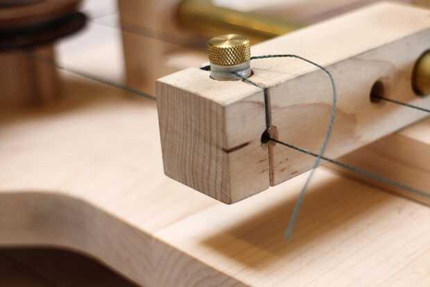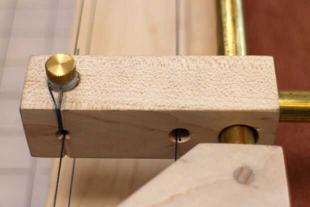 - El cable empieza atando un lazo al final de la línea de pesca y enganche en el tornillo de pulgar en el carro más cercano a la manivela. Los bucles de cable a través de la 1/8" Ø que está alineado con el tornillo y sale por el agujero hacia la manivela.