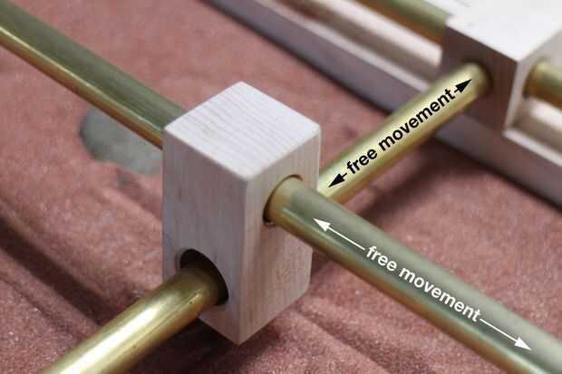Los orificios de la tubería en los carros y el stylus tienen insertos de latón que hice por martilleo el tubo de latón de 1/2" en el agujero, corte y avellanar el borde del latón. Esta hecha para menos fricción, y es un detalle agradable si usted mira de cerca.