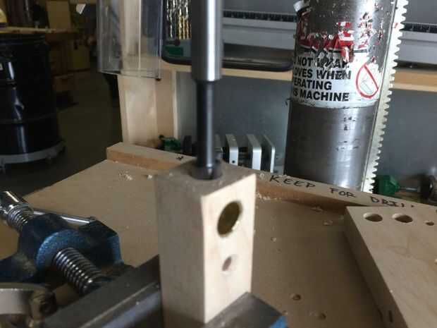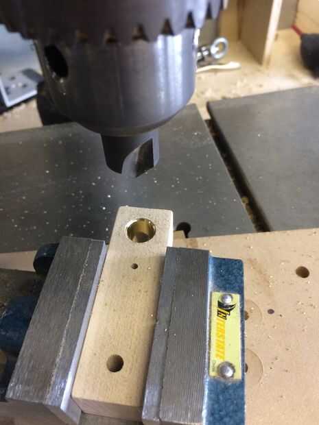 El orificio centrado en la ranura obtiene el roscado casquillo de latón. Esto fue un verdadero dolor para tornillo en la madera dura y arruiné 1 más de carretilla esta manera. Es muy difícil mantenerlos al ras en la parte superior, y es el mismo que el hueco de destornillador de cabeza plana en la parte superior la inserción tendrá la fuerza necesaria para atornillarlo. Eric Forman me enseñó este truco ingenioso para conseguir el inserto de tornillo en el uso de un tornillo de corte (10-24), un par de tuercas y un taladro que hizo mi vida mucho más fácil.