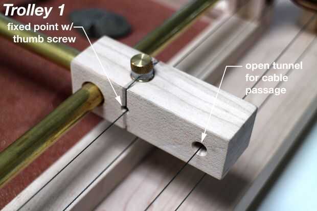 Los carros son las piezas de madera que se mueven a lo largo de los rieles del pórtico. Que son conducidos por el cable de giro sobre las poleas, y necesitan tener un túnel abierto para el cable pase a través y un punto fijo conectado al cable. Cada pórtico tiene un carro diferente a cada lado para lograr este movimiento.