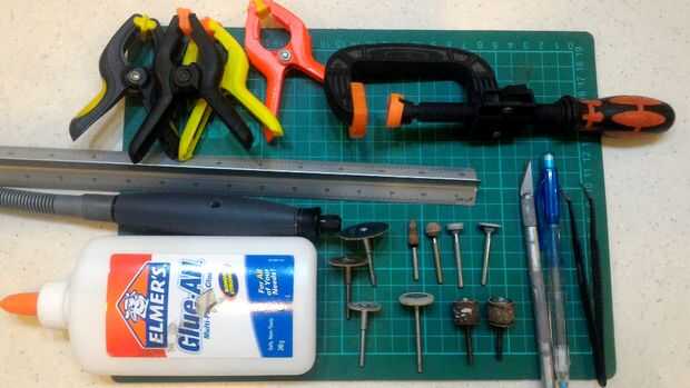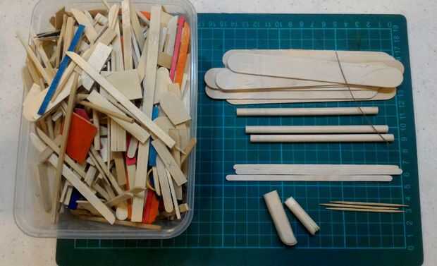 palitos de laminaron unen con pegamento blanco Elmers. Mayoría de los subcomponentes redondeos como el eje y las articulaciones donde de espigas y varias paletas tamaño palos tallados y lija para parecerse a tacos. La mayoría de las piezas más pequeñas eran de mi caja de repuestos incluyendo restos pinocha de mi proyecto snowspeeder.