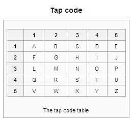 El código de Tap fue utilizado por prisioneros de Vietnam para comunicarse, generalmente golpeando en barras metálicas o paredes. Es una combinación de código Morse y el código de red reemplazando K con una C o X. los puntos (.) te dicen qué números para ir a desde la parte superior al lado, y el guión (/) decirle al separar una palabra.