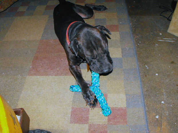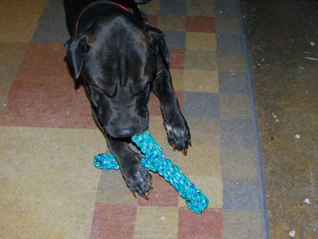 (Si usted está preocupado con su perro ingerir la cuerda de nylon, cuerda de yute natural 3/8" se puede utilizar)