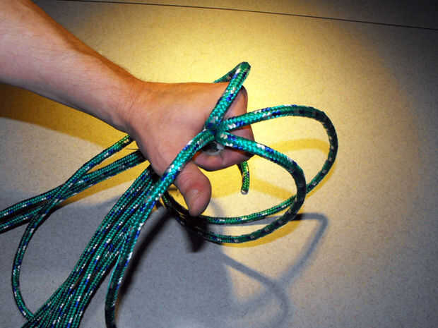 9. extiende las cuerdas sobre la parte superior del puño con una cuerda detrás de pulgar