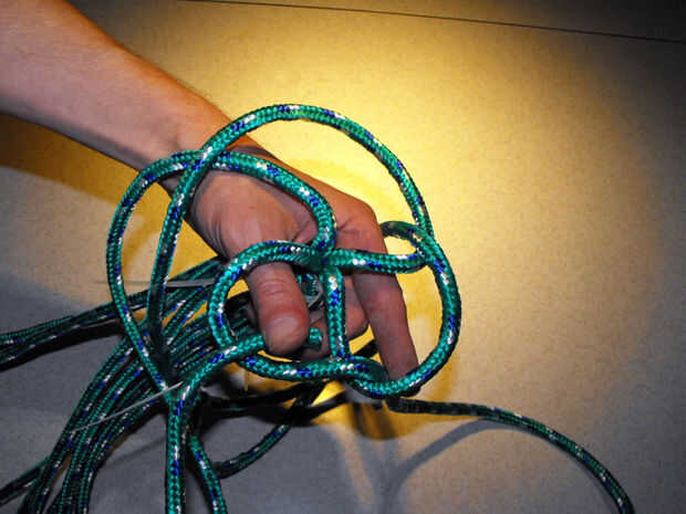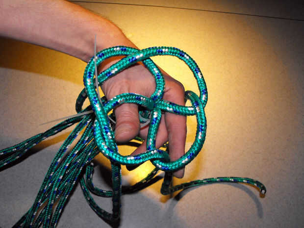 13. utilizando la última cuerda (cuerda 4) sobre la tercera cuerda (cuerda 3) y a través del lazo de la primera cuerda (cuerda 1) que se coloca alrededor del pulgar