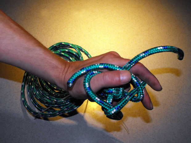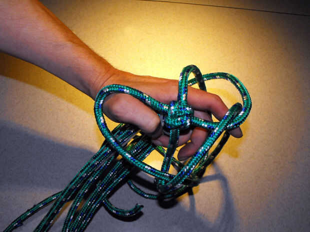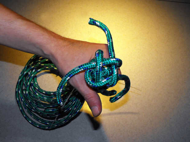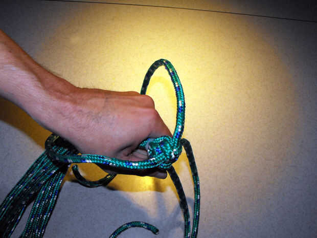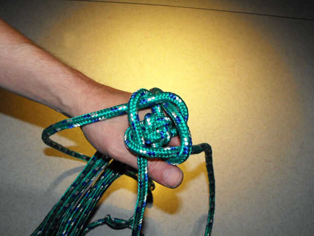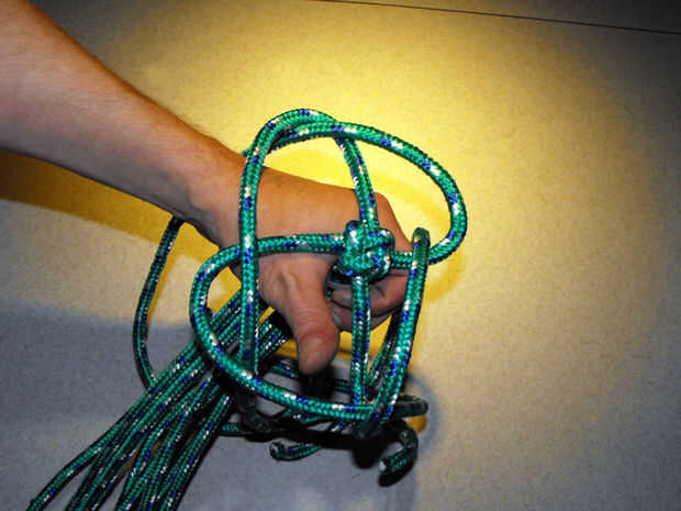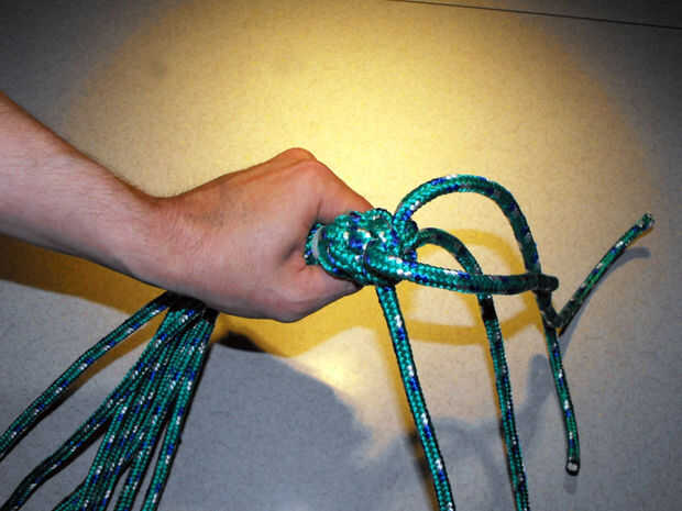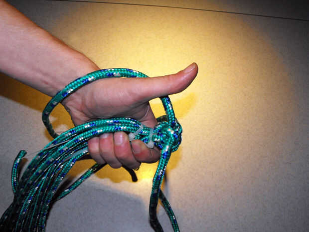 9. extiende las cuerdas sobre la parte superior del puño con una cuerda detrás de pulgar