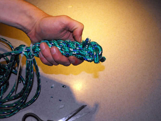 nuestro perro Dodger Ripea los juguetes del perro normal aparte en unos 15 minutos. "Juguetes indestructible" toman un poco más ;)Aprendí cómo hacer un nudo de puño de mono en un festival malabares unos años--hice a Dodgers un juguete de cuerda