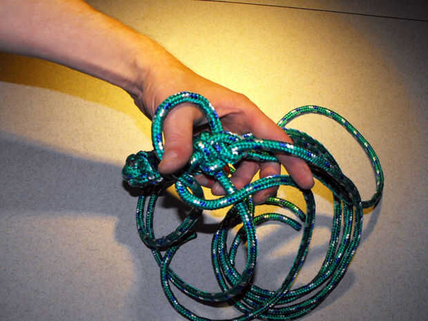 13. usando la última cuerda (cuerda 4) sobre la tercera cuerda (cuerda 3) y a través del lazo de la primera cuerda (cuerda 1) que se coloca alrededor del pulgar